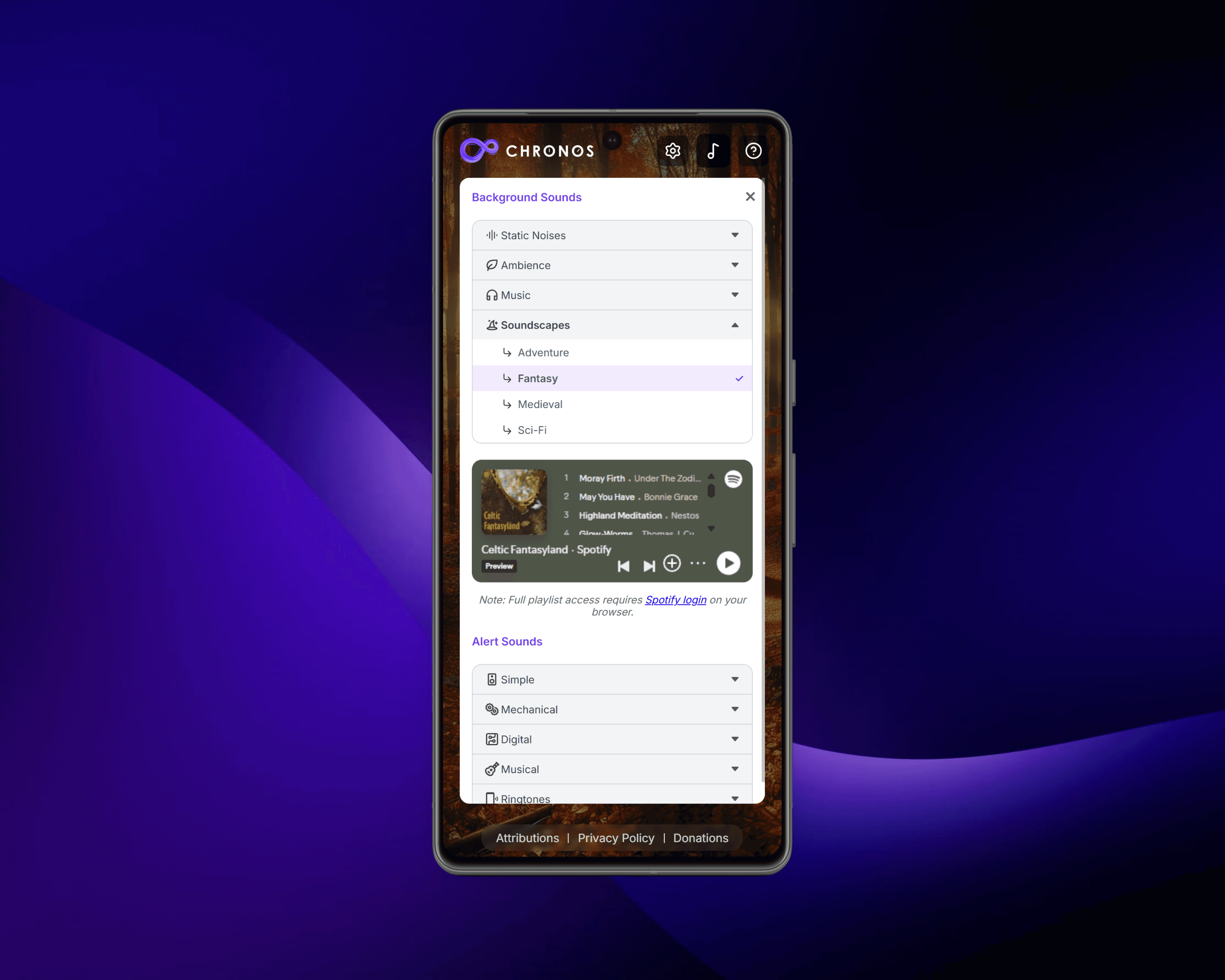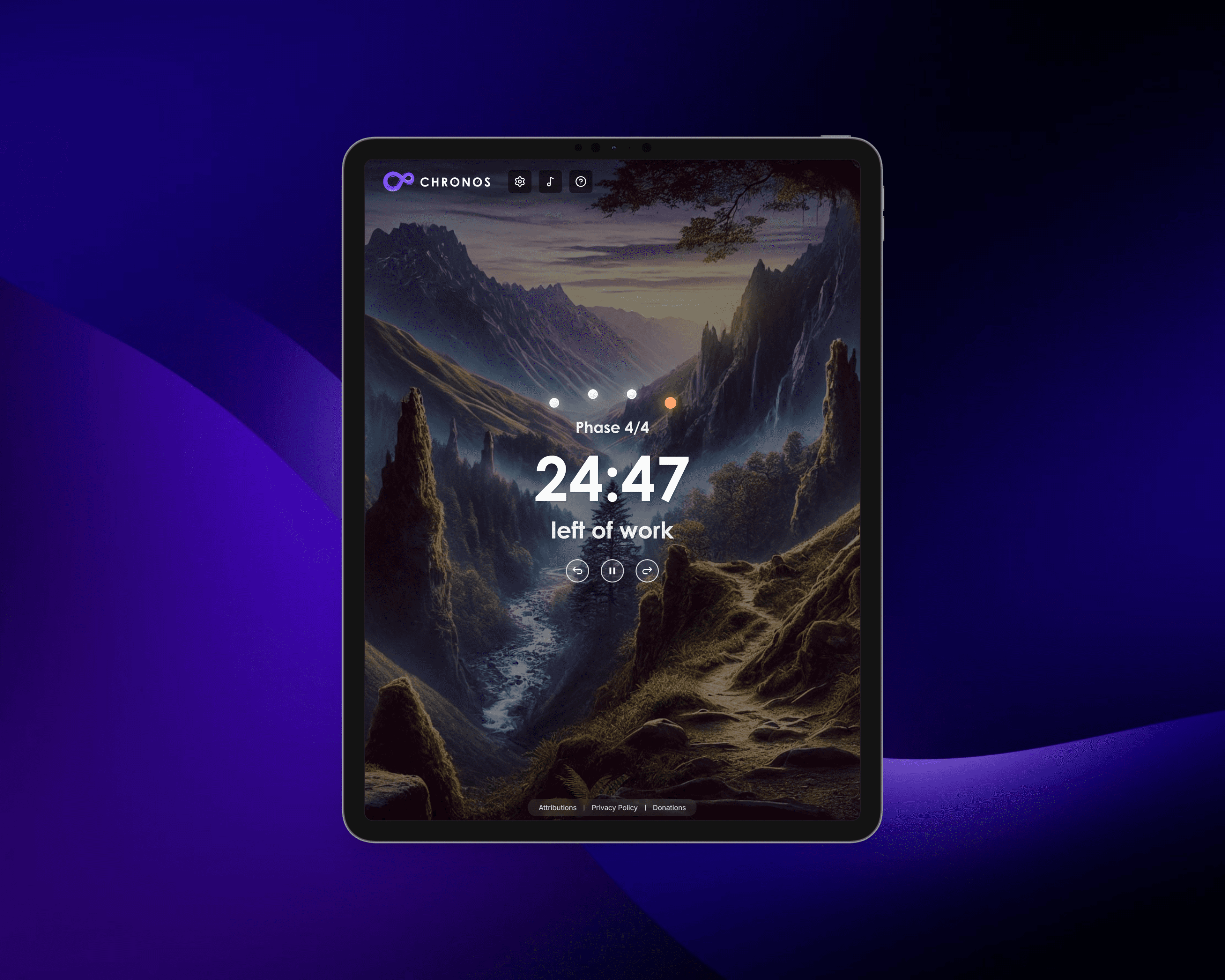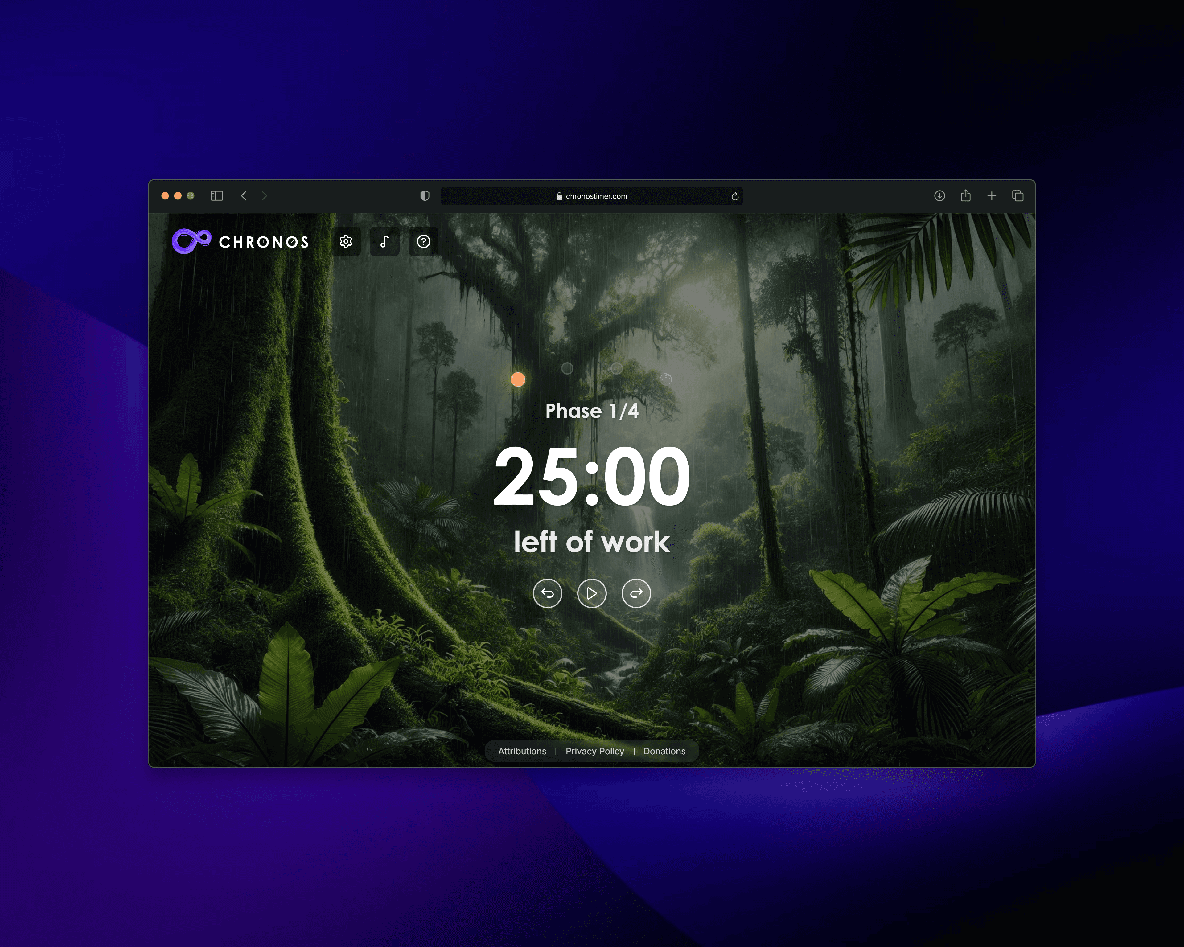 I built Chronos as a more atmospheric take on the Pomodoro technique. Custom timers, selectable backgrounds, and audio cues let users shape their own focus environment. The interface stays minimal and out of the way so the work stays front and center.