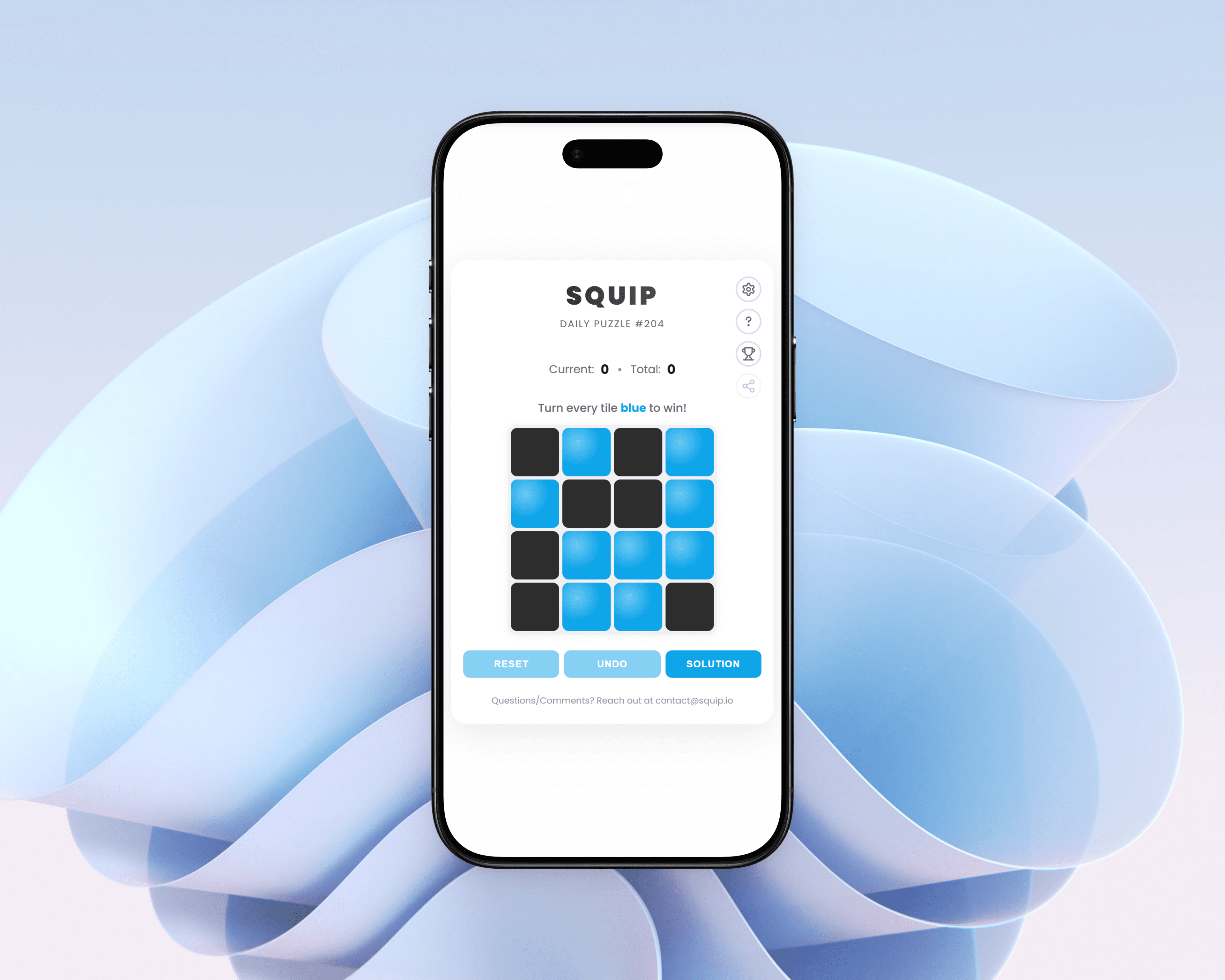 Squip is a daily logic puzzle with one rule: turn every tile to one color. Clicking a tile flips it and its neighbors in patterns that shift based on position (Plus, T, or L shapes). Every puzzle has an optimal 7-move solution, and finding it is the real challenge. I designed the game and its interface to be clean enough for a quick daily session but satisfying enough to keep you thinking after you close the tab.