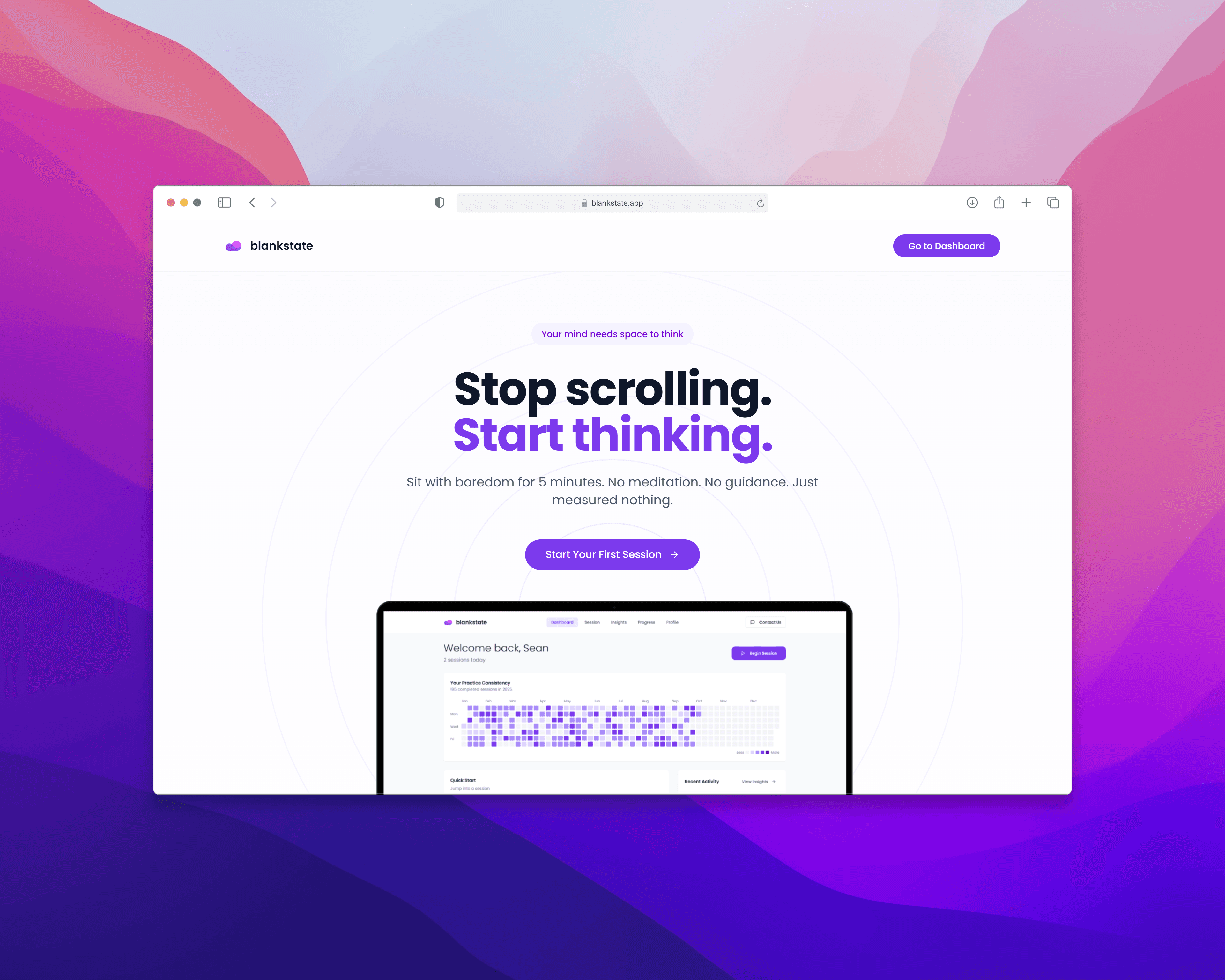 What happens when you stop filling every spare moment with stimulation? blankstate is a web app I researched, designed, and developed to find out. It pairs timed distraction-free sessions with cognitive baselines and progress tracking to help users reclaim mental clarity. No meditation, no guidance, just measured nothing.