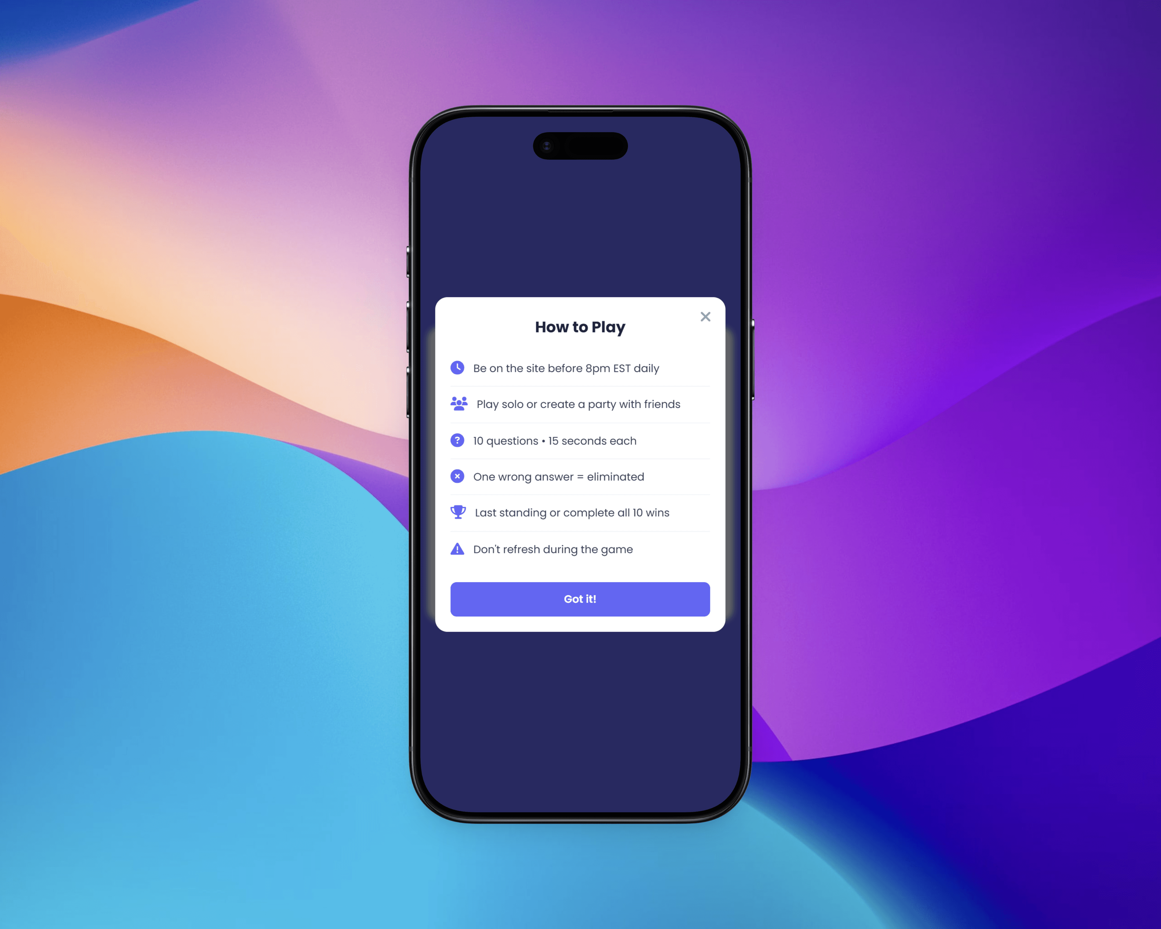 Triviarena is a daily trivia battle royale I designed and built from the ground up. Every night at 8pm EST, players worldwide enter a real-time elimination format: 10 questions, 15 seconds each, one wrong answer and you're gone. Friends can party up to compete together, and persistent stats keep people coming back. Think Wordle meets live competition.